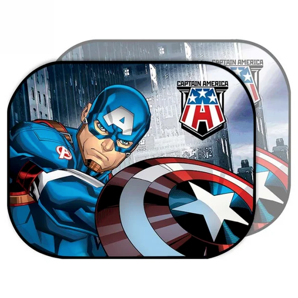 Solafskærmning til sidevindue med Captain America tryk – 2 stk. Solafskærmning fra Disney til sidevinduerne på bagsædet, som både pynter bilen og dæmper solens stråler gennem vinduet, hvilket giver en mere behagelig tur for passagerne på bagsædet. Den er desuden tilpasset med nyt og fangende grafik af Disneys elskede karakterer. Solafskærmningen giver UV-beskyttelse og har en sugekop funktion til påføring på vinduet. Den er testet og certificeret i overensstemmelse med europæiske standarder. Dimensioner: 44x35 cm