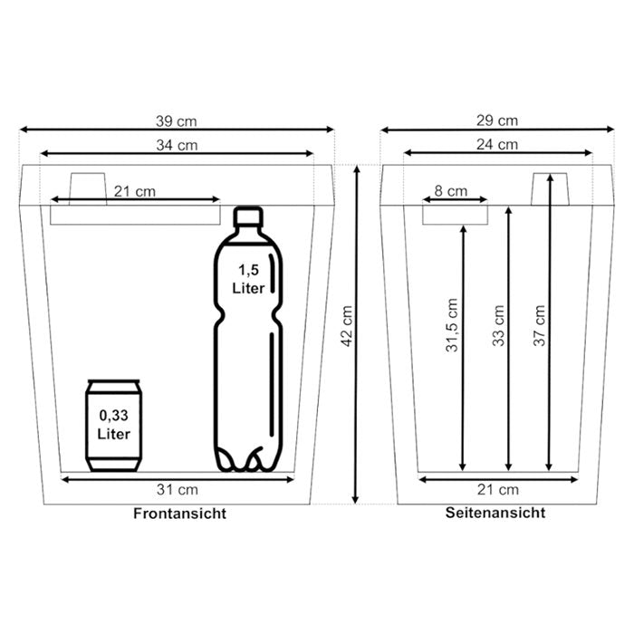 Velegnet til 8x1 liter flasker (30,5 cm stående) eller 1x1,5 liter flasker (35 cm stående), 32x0,33 L drikkevaredåser.
